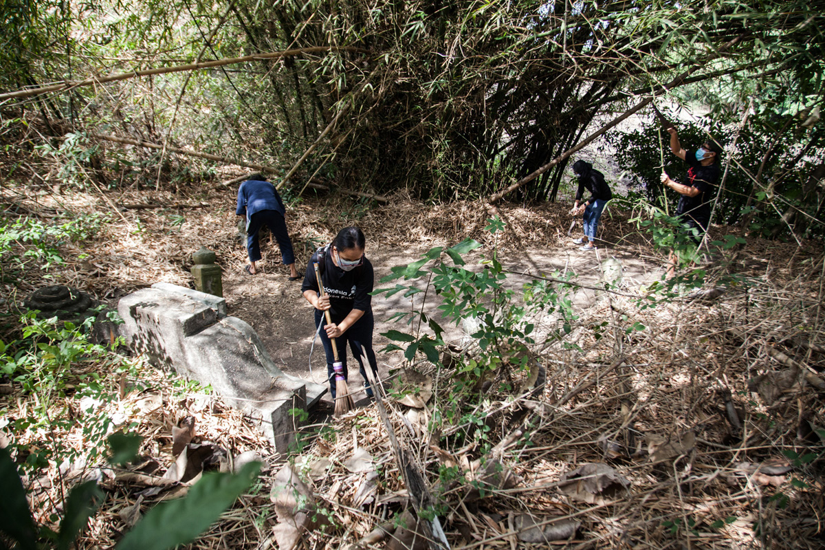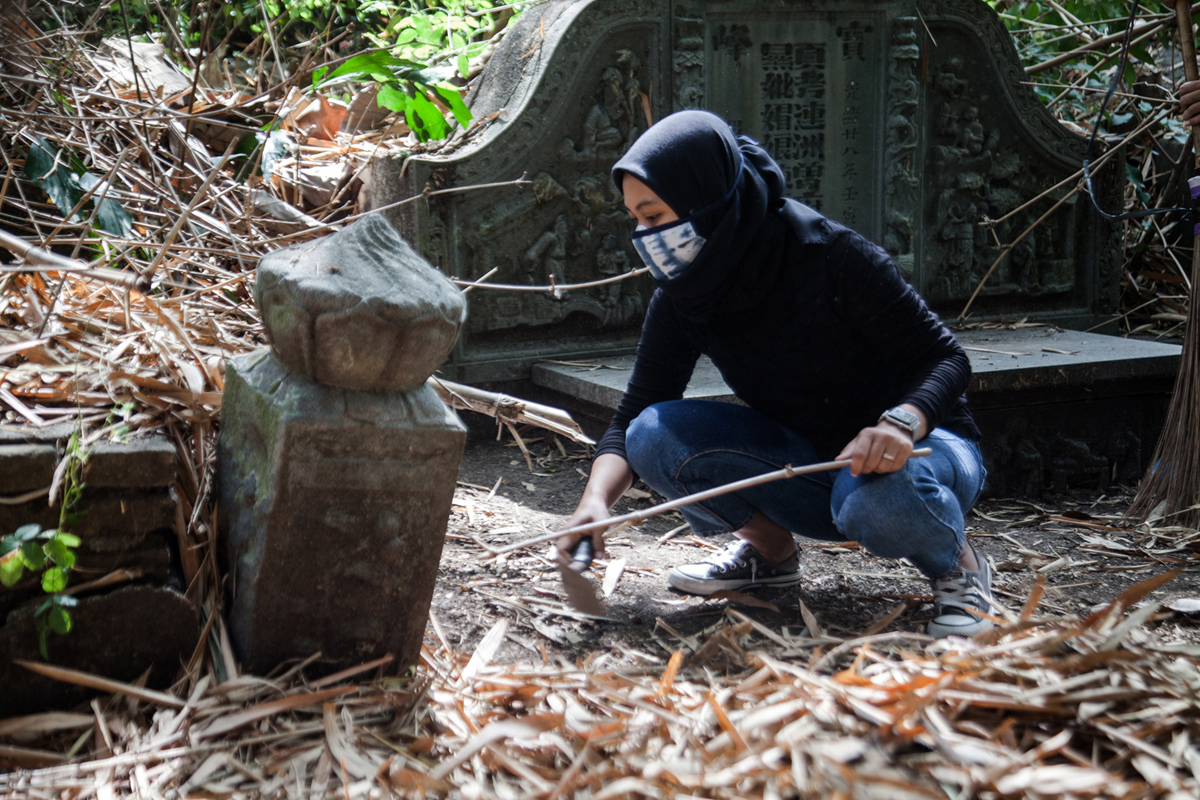 Bermodal sapu lidi, arit, dan parang yang dibawa dari rumah masing-masing, mereka membersihkan makam yang awalnya tidak terlihat jelas sampai tampak struktur bangunannya. Pengalaman bertahun-tahun bersinggungan dengan makam membuat mereka hafal dengan desain arsitekturnya. Bahkan, mereka akan mengidentifikasi jenis material yang digunakan dalam sebuah makam, apakah bahannya dari batu, semen, kayu, atau porselen. Terkadang jumlah uang yang harus dikeluarkan dalam membuat satu permakaman pun menjadi salah satu bahan diskusi mereka selama telusur/bebersih makam.
